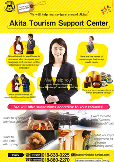 Akita Tourism Support Center provides tourist information within Akita Prefecture. We introduce variety of information such as seasonal sightseeing spots, accommodation, transportation, luggage storage, and private tours, etc. on our website. If you have any questions about travel in Akita, please feel free to contact us by phone or email.